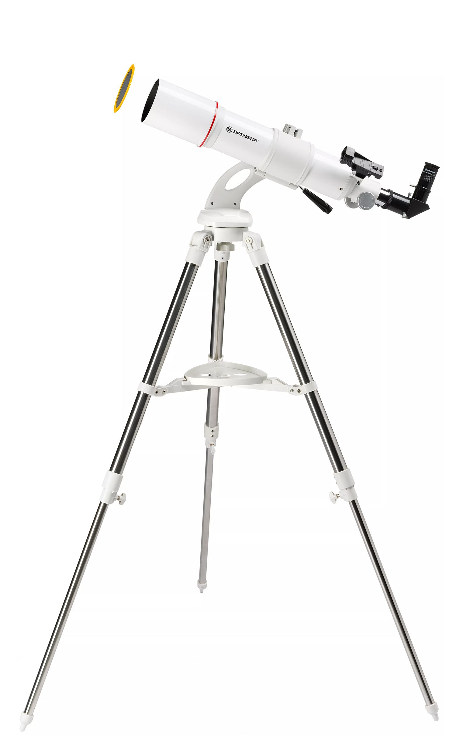 When looking at the technical data, 80mm aperture may not look too impressive. During the observation the impact of the 31% more light gathering power in respect to a 70mm refractor are easily visible: details are seen more clearly in the Bresser NANO AR-80/640 NANO and from a distance of 600 million km the main cloud bands on the planet Jupiter and many Messier objects gets visible. Richfield telescope with high quality achromatic glass lens and a short focal length of 640mm. Suitable also for traveling and to observe large open star clusterns and the milky way. The telescope arrives with a wide array of accessories and almost pre-assembled – observation can start immediately. The Bresser NANO is a light-to-medium-duty alt-azimuth mount with tripod designed to quickly and easily accept small to medium sized refractors, such as the AR-90s, AR-102s, AR-102xs and the ED-80 APO. Lightweight, fast Newtonians will also match up nicely with the Bresser NANO AZ mount. As long as your telescope does not exceed 8 pounds and has a Vixen-Style Universal Dovetail bar for mounting the telescope to the mount head, you are good to go. The stainless steel tripod that comes standard with the Bresser NANO AZ mount has adjustable legs and a wide foot print, which makes the tripod more stable. Spreader vanes with an acessory tray locks against the inside of the legs to secure the tripod even further, and keep vibrations to a minimum.