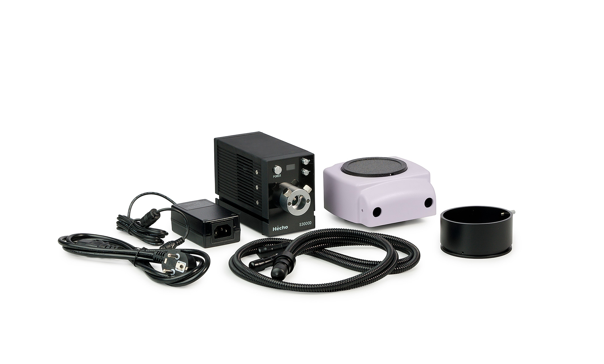 Mezi hlavici mikroskopu a objektiv se zoomem je namontován nástavec. Světelný zdroj je v krytu svítilny. Kryt svítilny je k nástavci připojen pomocí flexibilního duálního světlovodu. Světlo vstupuje do nástavce přes světlovod a poté je přes objektiv nasměrováno na vzorek. Tato metoda osvětlení umožňuje získat jasný obraz bez odlesků a stínů, a to i při velkém zvětšení objektivu mikroskopu.